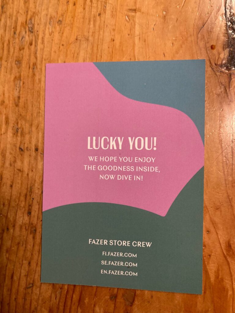 Fazerin herkkulahjan mukana tulleessa kortissa ei ollut lainkaan suomen kieltä. Toisella puolella korttia luki Fazerin logon lisäksi: Unwrap the magical moments. Northern magic. Made real.